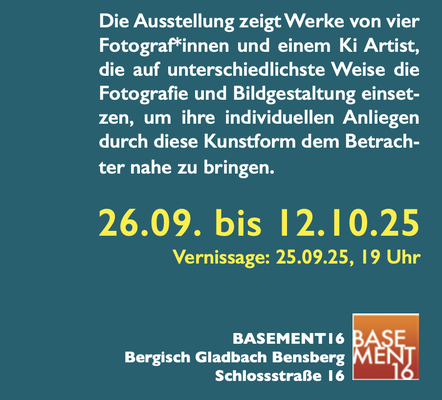 Etwas Historie: Nachdem ich im Februar 23 begonnen hatte, die ersten Bilder mit Hilfe der Ki zu programmieren, konnte ich meine Arbeiten im November 23 erstmals (mit erstaunlichem Erfolg) in der Galerie Basement 16 in Köln / Bensberg einem breiten Publikum vorstellen.